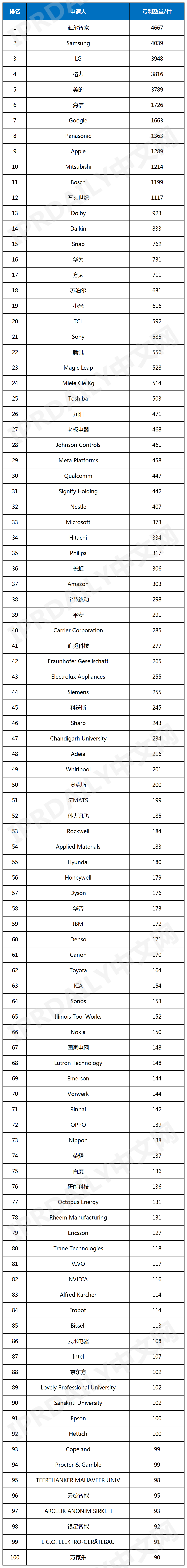 基于聪慧家庭手艺相关的环节词和分类号进行限制,统计2025年1月1日至2025年12月31日正在全球申请并公开的聪慧家庭发现专利(同申请号归并)。聪慧家庭(Smart Home),也称为智能家居,以室第为根本平台,通过最新的分析布线手艺、高速收集通信手艺、以及高清音视频手艺,将家居糊口的各类设备进行更为智能化的集成。这不只鞭策了室第设备和家庭日常事务办理系统的进一步高效化、智能化,同时也显著提高了家居糊口的平安性、便当性、舒服性和艺术性,并实现环保节能的栖身。按照Bonafide Researh发布的《2031年全球智能家居市场概览》研究演讲,2025年全球智能家居市场规模为1607。5亿美元,估计到2031年这一规模将冲破4382。5亿美元,对应2026年至2031年间的复合年增加率 (CAGR) 达18。67%。此外,国际数据公司IDC的研究显示,2026年中国智能家居市场出货量将冲破3亿台;虽然国补政策短期带动线下零售市场回暖,但持久来看线上渠道的分流效应仍正在持续。从行业款式来看,市场正向着生态化标的目的深度演进,“大而全”的厂商劣势愈发凸显,行业合作也从“单品合作”转向“场景化生态合作”。需求端则聚焦“感情价值”取细分范畴,家庭疗愈、情场景加快兴起,轻量化类产物也备受市场关心。从2020年起头,IPRdaily持续关心全球聪慧家庭发现专利公开环境。基于对聪慧家庭手艺的理解,IPRdaily通过对相关的环节词和分类号进行限制,数据统计2025年1月1日至2025年12月31日正在全球申请并公开的聪慧家庭发现专利(同申请号归并),发布2025年全球聪慧家庭发现专利排行榜(TOP 100)[2020年全球聪慧家庭发现专利排行榜(TOP100)、2021年上半年全球聪慧家庭发现专利排行榜(TOP100)、2022年上半年全球聪慧家庭发现专利排行榜(TOP100)、2022年全球聪慧家庭发现专利排行榜(TOP100)、2023年上半年全球聪慧家庭发现专利排行榜(TOP100)、2023年全球聪慧家庭发现专利排行榜(TOP100)、2024年上半年全球聪慧家庭发现专利排行榜(TOP100)、2024年全球聪慧家庭发现专利排行榜(TOP100)、2025年上半年全球聪慧家庭发现专利排行榜(TOP100)](点击题目可间接查看原文)。榜单如下:按照榜单显示:聪慧家庭市场初步构成保守家电企业、互联网企业、科技企业三大阵营;此中,